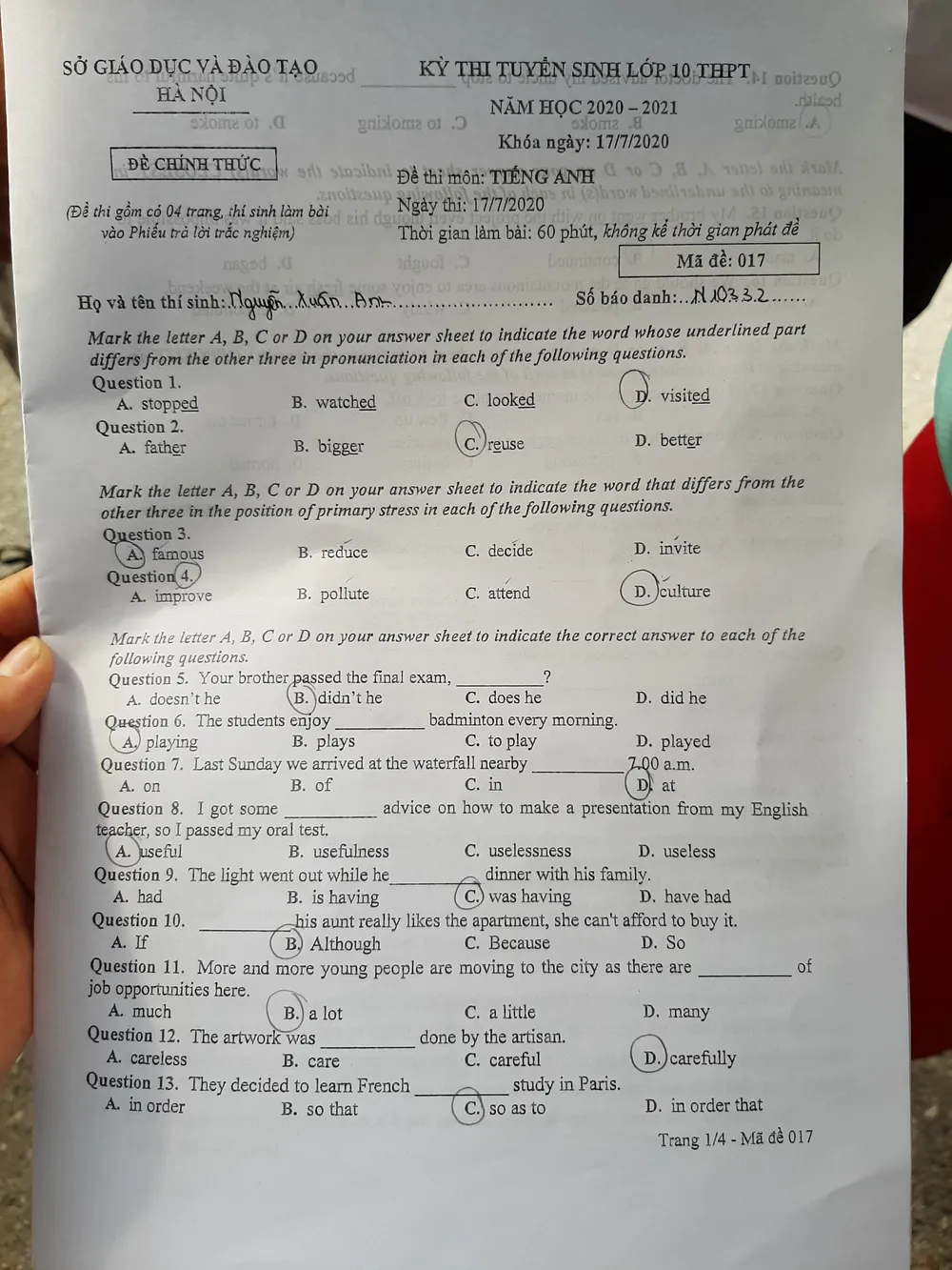 Mời quý phụ huynh cùng các bạn tham khảo đề thi tiếng Anh lớp 10 Hà Nội dưới đây: