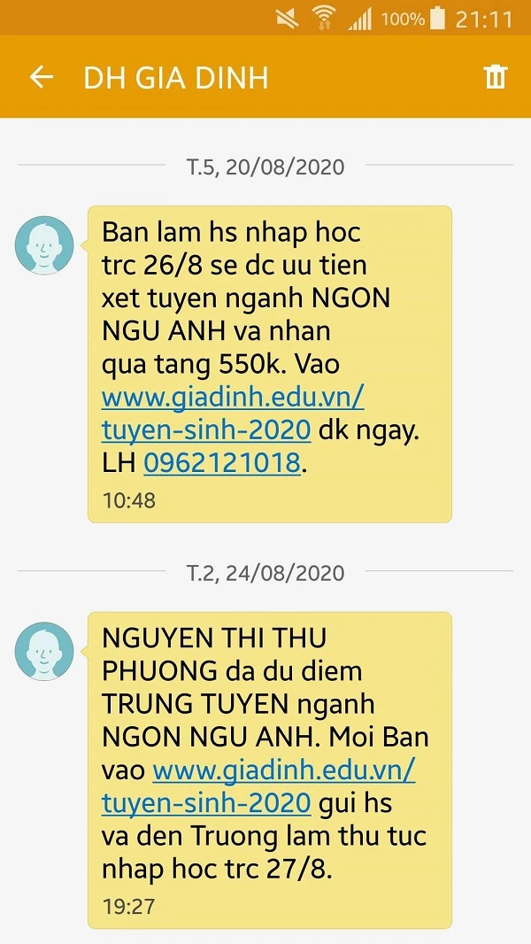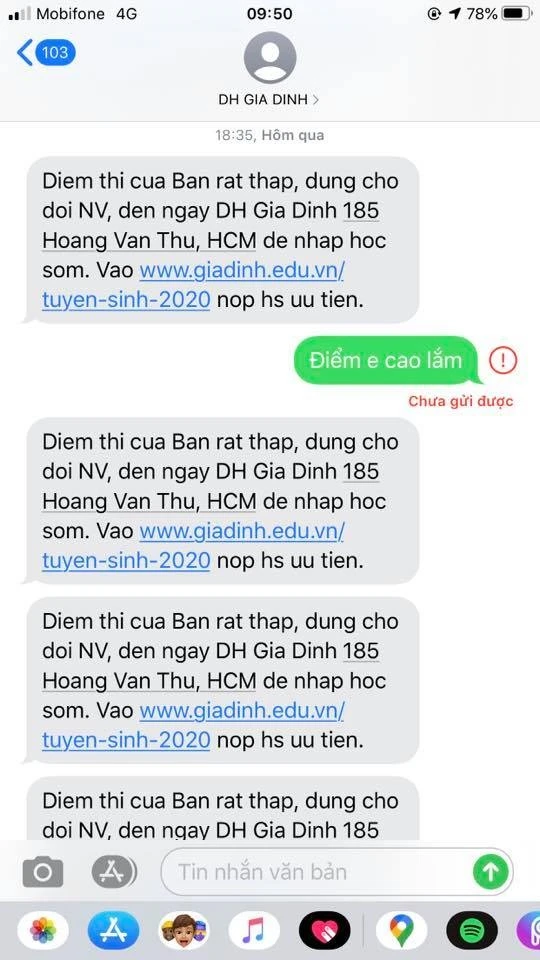 Nội dung tin nhắn khiến hàng loạt thí sinh không khỏi bức xúc khi nhận được qua số điện thoại cá nhân và được cho là gửi từ Trường ĐH Gia Định, TP.HCM.