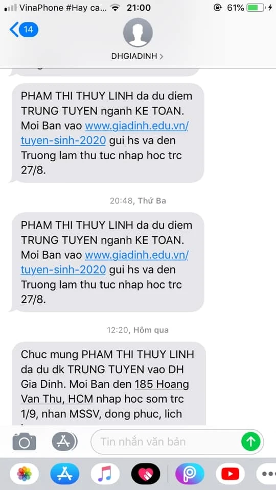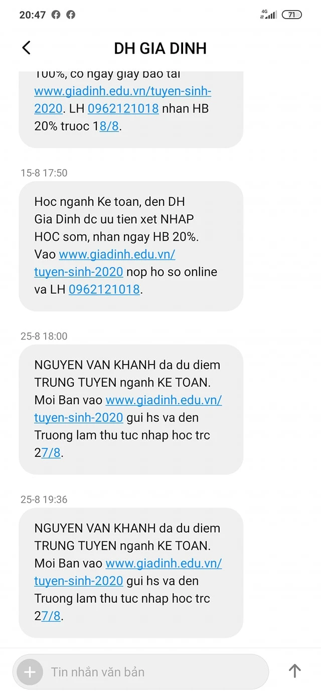 Bên cạnh đó, qua facebook, nhiều thí sinh cho rằng trước đó các em còn nhận được những tin nhắn chúc mừng đủ điều kiện trúng tuyển vào trường ĐH Gia Định và mời đến trường làm thủ tục nhập học. Tin nhắn ghi đúng tên và còn ghi thông tin trúng tuyển vào từng ngành học cụ thể. Đáng nói, các em không hề đăng ký vào trường qua bất kỳ hình thức nào nhưng vẫn nhận thông tin.