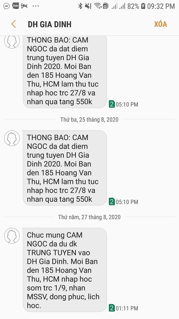 Tin nhắn từ Trường ĐH Gia Định gửi đến nhiều thí sinh