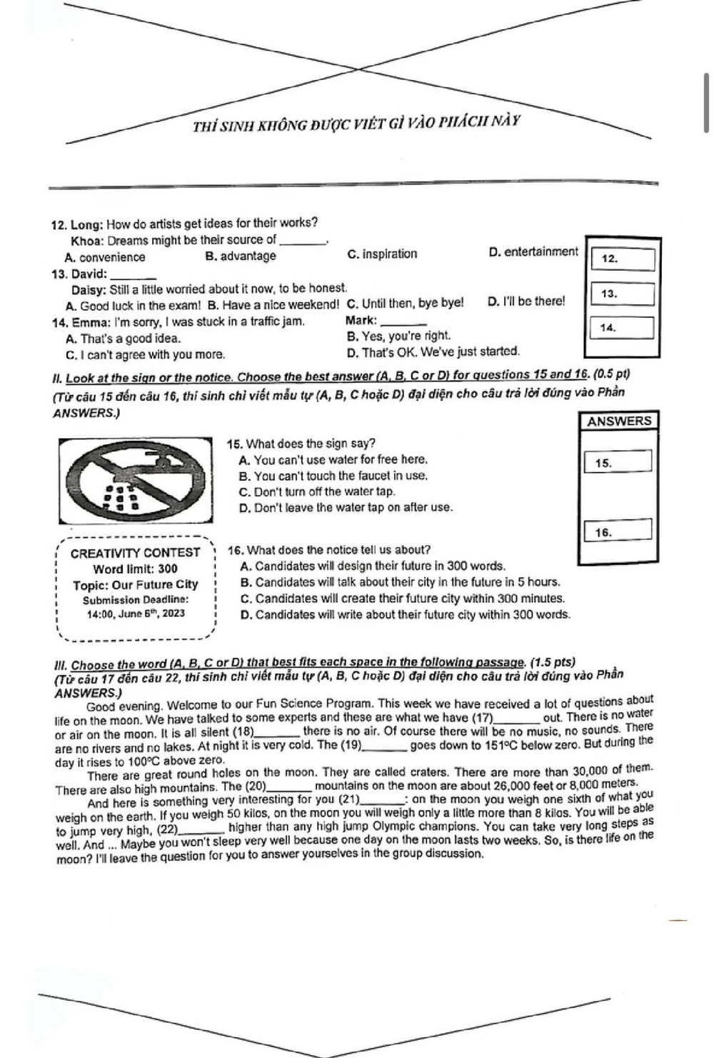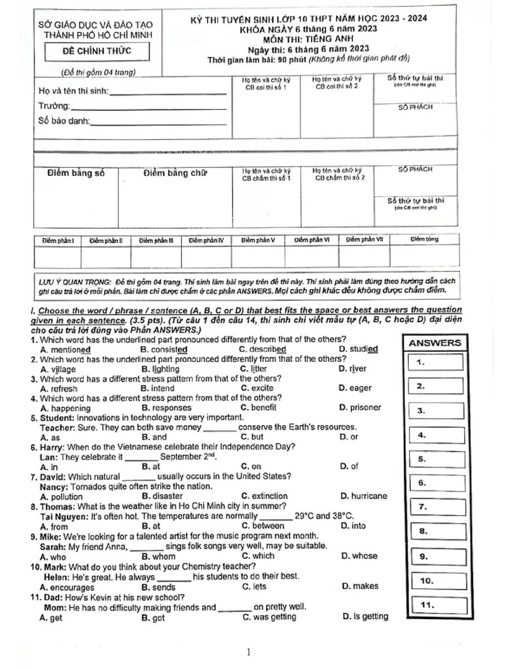 Đề thi tiếng Anh vào lớp 10 tại TP.HCM. |