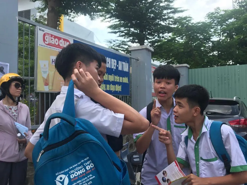| Phụ huynh 'nín thinh' cho con khỏi mất tinh thần Đợi con ra khỏi phòng thi, cô Hải, phụ huynh có con thi tại điểm tho THPT Gia Định, chia sẻ: Tụi nhỏ ra cũng kể cô nghe về bài làm, nhưng mà cô không chủ động hỏi tụi nó đâu. Thấy tụi nó cười là cô an tâm rồi. Còn những môn thi sau nữa, không để chúng nó mất tinh thần, cứ động viên tụi nó là được rồi. Em Nguyễn Quỳnh Thư ( con cô Hải) cho biết. Đề văn phân hóa HS khs tốt, nhưng cũng không quá sức. Em ôn bài khá tốt nên bài làm cũng mức khá. Môn thi thứ nhất khởi đầu như vậy là quá tốt rồi ạ. Em sẽ cố gắng hơn ở những môn thi sau. |