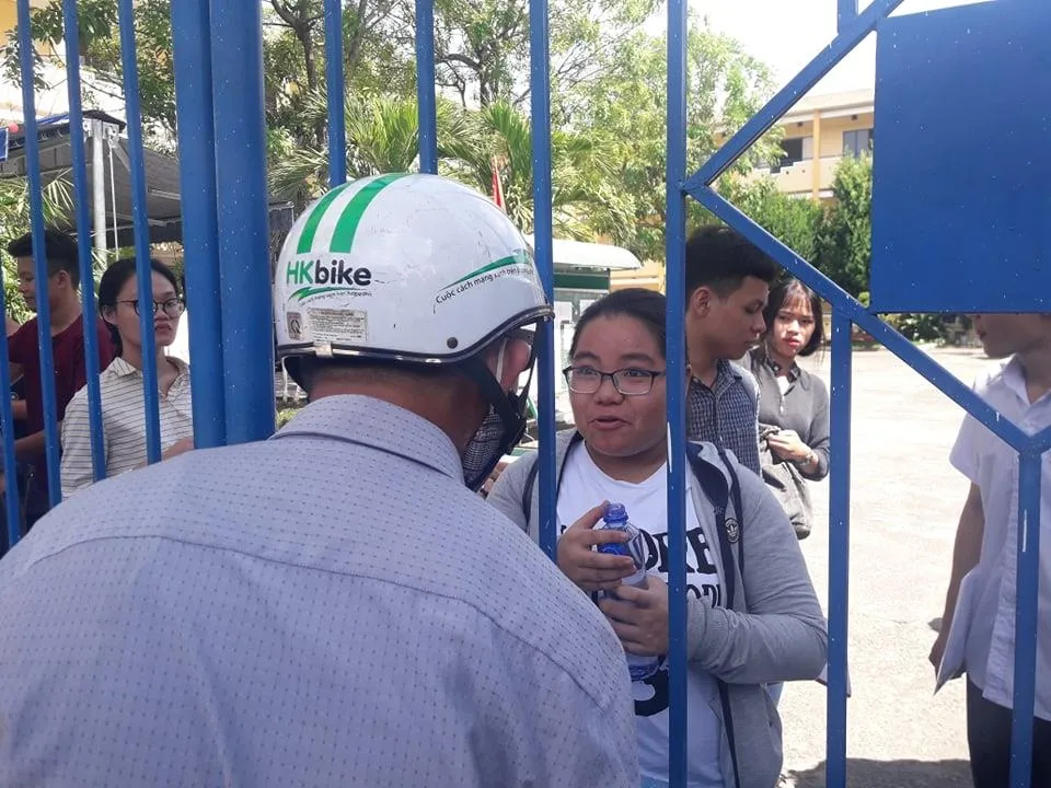 Môt phụ huynh đón con tại cổng trường thi, điểm thi trường THPT Nguyễn Thượng Hiền, quận Liên Chiểu.
