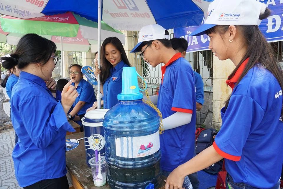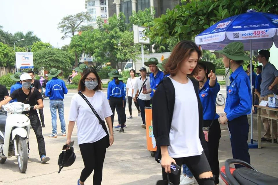Sinh viên tình nguyện hỗ trợ thí sinh đến làm thủ tục dự thi. Ảnh: Kiều Vũ