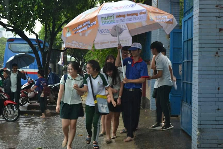 Làm thủ tục thi xong các em học sinh bị mắc mưa to, đứng đợi phụ huynh đón về. Trong ảnh: Thí sinh tại điểm thi THPT Tân Bình, quận Tân Phú. Ảnh: PHƯƠNG ANH