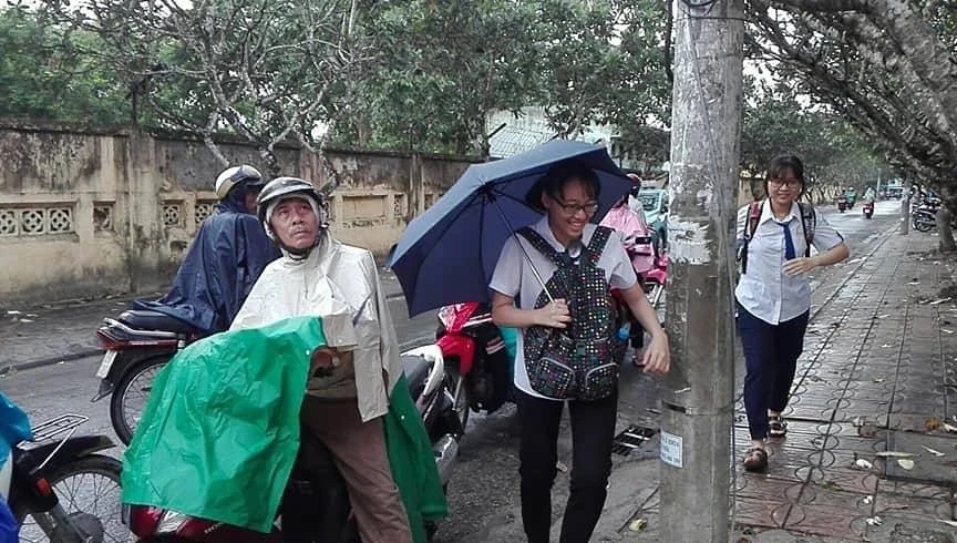 Thí sinh tại Cần Thơ vội vã đi trong mưa đến điểm thi cho kịp giờ làm thủ tục. Ảnh: HẢI DƯƠNG