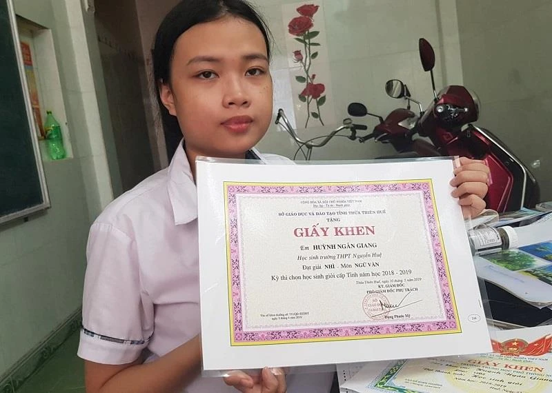 Với quyết tâm đó, suốt ba năm học cấp 3, Giang luôn giành được danh hiệu học sinh giỏi toàn diện. Giang còn được Trường THPT Nguyễn Huệ chọn vào đội thi học sinh giỏi môn Ngữ văn cấp tỉnh và giành được giải nhì tại kỳ thi năm 2018.