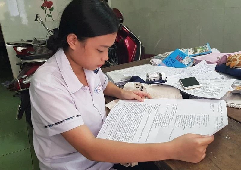 Trong kì thi THPT Quốc gia năm 2019, tại điểm thi Trường THPT Nguyễn Huệ (TP Huế, Thừa Thiên-Huế), thí sinh Huỳnh Ngân Giang, Trường THPT Nguyễn Huệ dự thi với bộ đề thi được in riêng trên giấy khổ A3 chứ không phải A4 như bao đề thi khác.