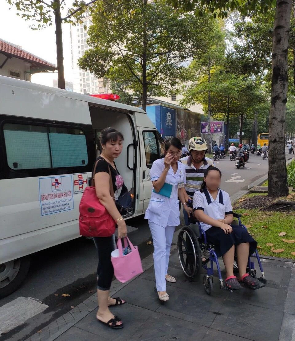 Thí sinh được BV đưa đến điểm thi bằng xe cấp cứu và chăm sóc y tế đặc biệt là em NLAT (17 tuổi, ngụ quận 4, TP.HCM) dự thi kỳ thi THPT quốc gia ở điểm thi THPT Marie Curie (quận 3) vào sáng 25-6.