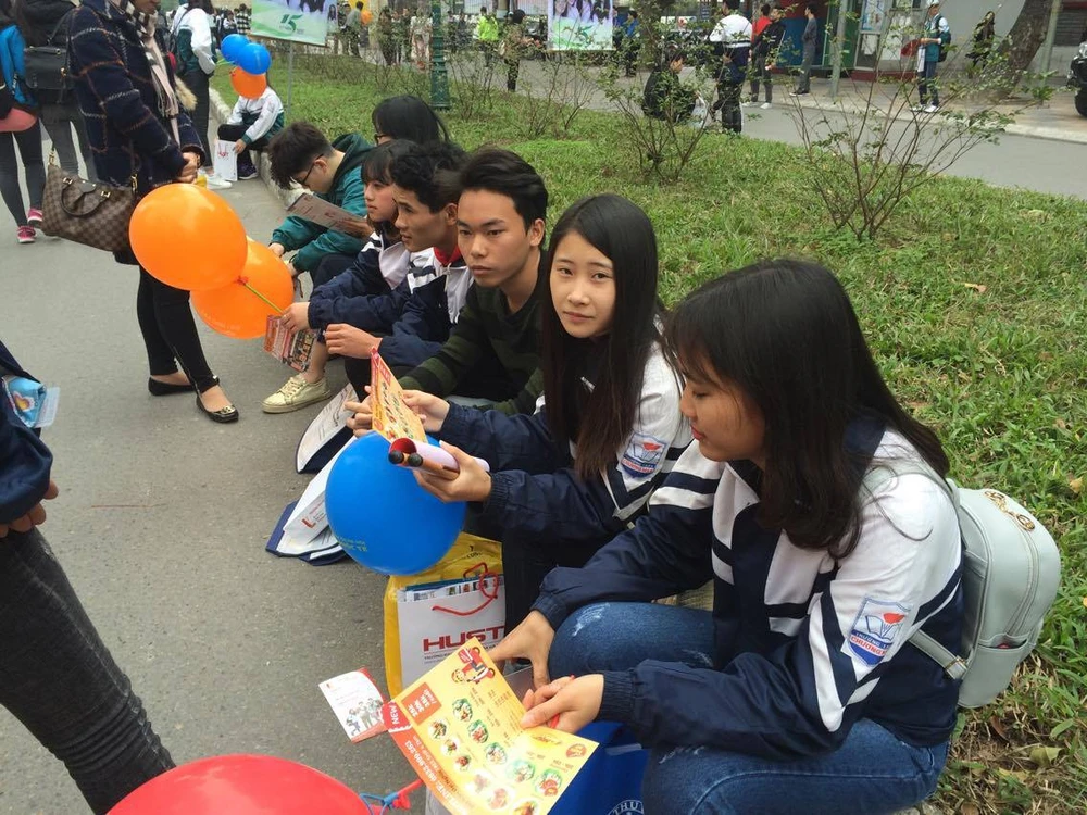 Các em học sinh ngồi chờ vào tư vấn trong ngày hội tuyển sinh.
