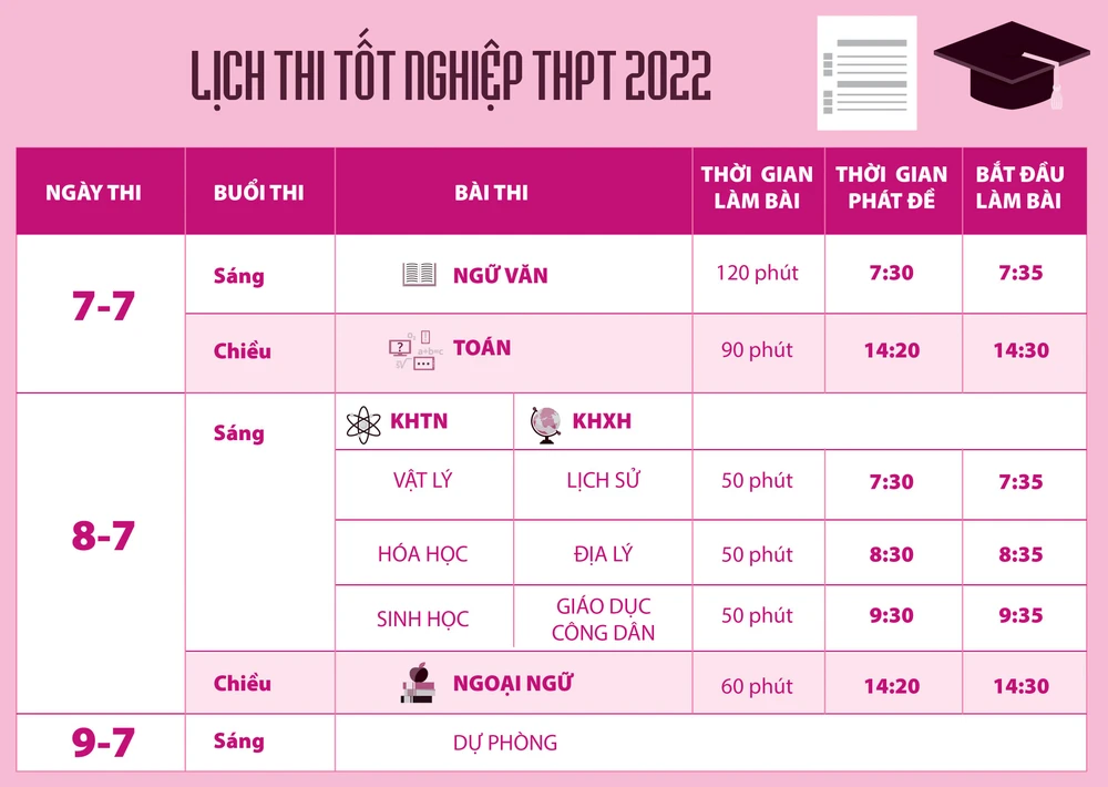 Kỳ thi tốt nghiệp THPT năm 2022 chính thức diễn ra trong hai ngày 7 và 8-7. Trong đó, ngày 7-7, thí sinh sẽ thi môn Văn (buổi sáng) và Toán (buổi chiều). Ngày 8-7, thí sinh sẽ thi một trong hai bài thi tổ hợp gồm Khoa học Tự nhiên hoặc Khoa học Xã hội (buổi sáng) và môn Ngoại ngữ (buổi chiều).