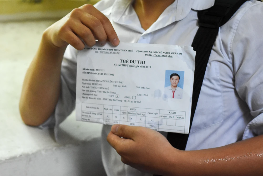 Em Phạm Nguyễn Tiến Đạt kiểm tra lại thẻ dự thi, vì bị ướt mưa nên có một số chỗ bị ướt. Ảnh: NGUYỄN DO