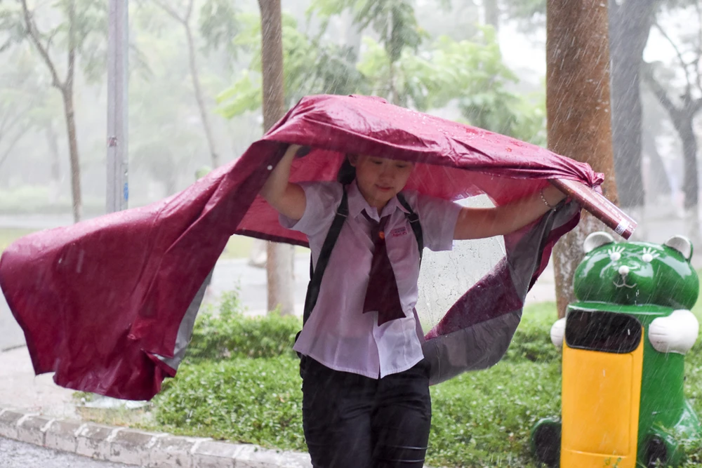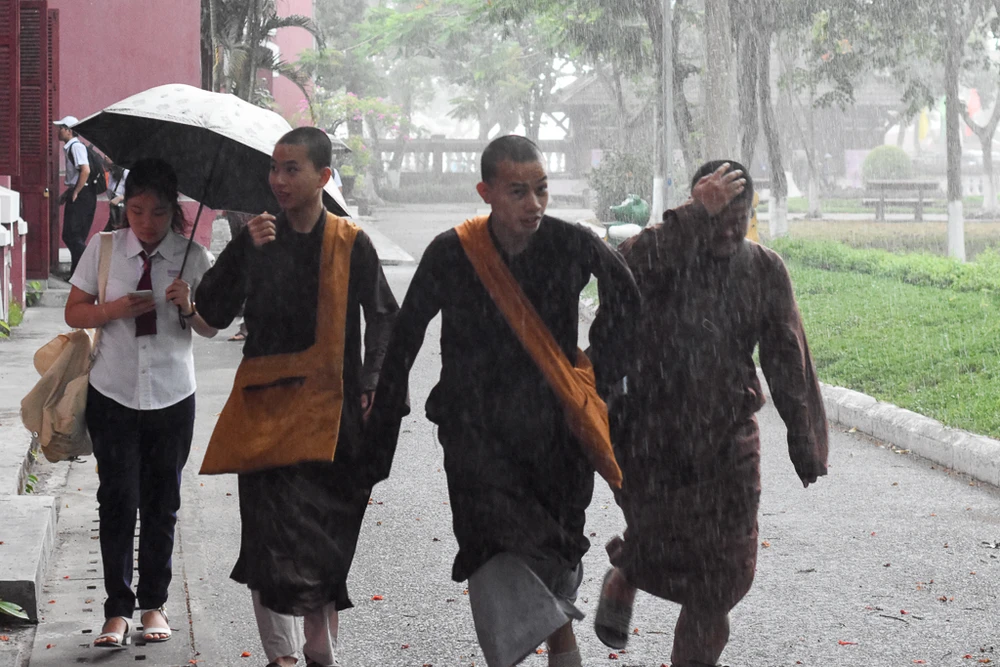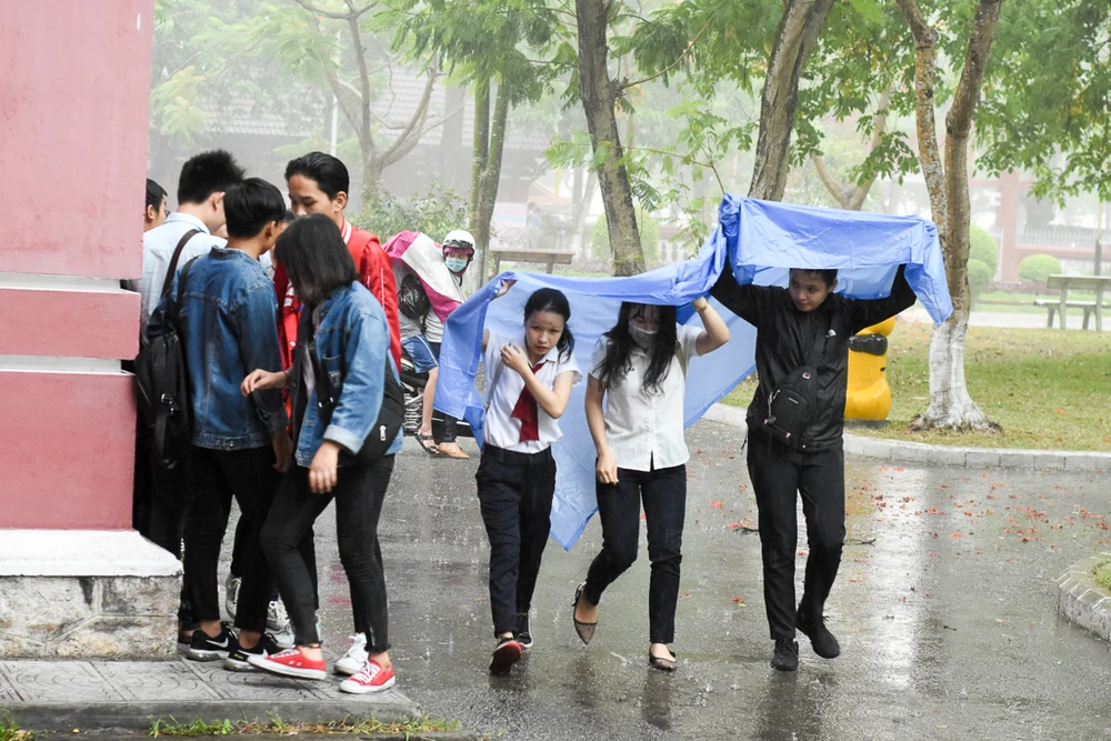 Tại điểm thi Trường THPT Hai Bà Trưng, nhiều sĩ tử vội vã chạy tìm chỗ trú mưa. Ảnh: NGUYỄN DO