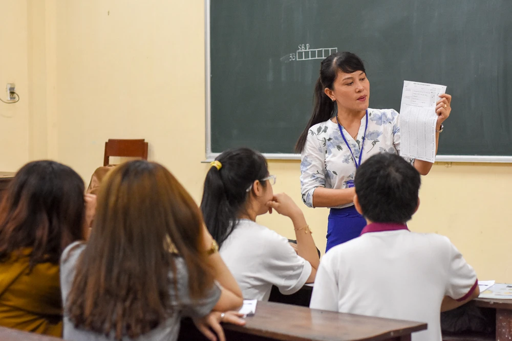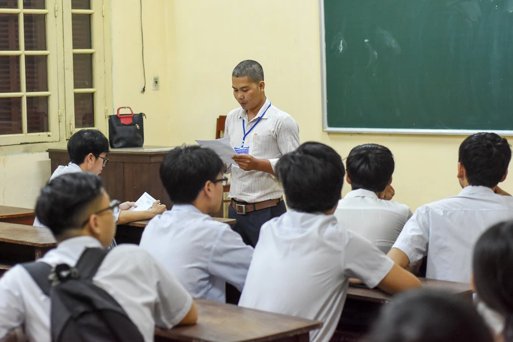 Cán bộ coi thi đọc nội quy kỳ thi và hướng dẫn các sĩ tử kiểm tra lại thông tin trên giấy báo thi. Ảnh: NGUYỄN DO