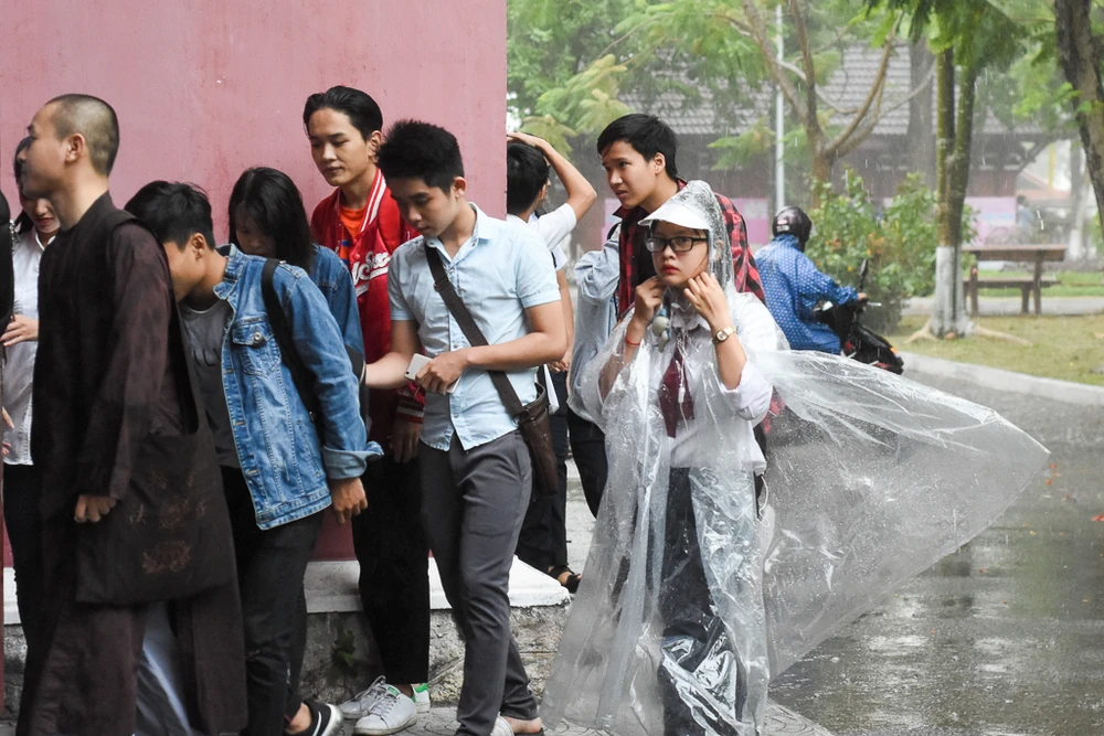 Đến khoảng 14 giờ, cơn mưa bất chợt kéo đến khiến nhiều thí sinh không chuẩn bị áo quần mưa bị ướt sũng. Ảnh: NGUYỄN DO