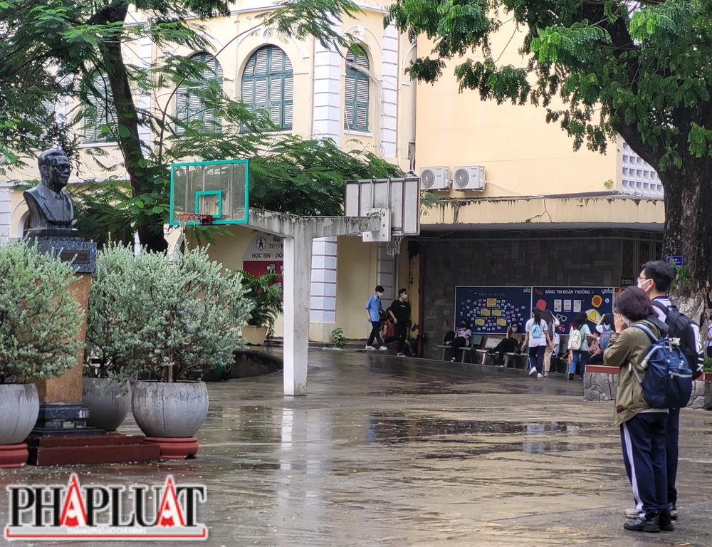 Trong cơn mưa nhẹ, không ai bảo ai, nhiều em đứng nghiêm trang, kính cẩn trước tượng của Giáo sư - Viện sĩ Trần Đại Nghĩa giữa sân trường. Các em học sinh cho biết, đây là truyền thống tốt đẹp của học sinh trường mình.