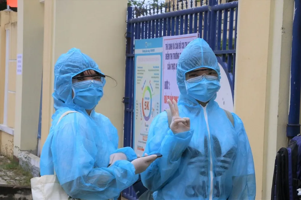 Ghi nhận tại điểm Trường THPT Võ Chí Công, 41 thí sinh thuộc diện F1, F2 và thí sinh ở các khu cách ly được xe y tế chở đến điểm thi để làm thủ tục dự thi. Các em được trang bị đồ bảo hộ, đo thân nhiệt trước khi vào phòng thi.