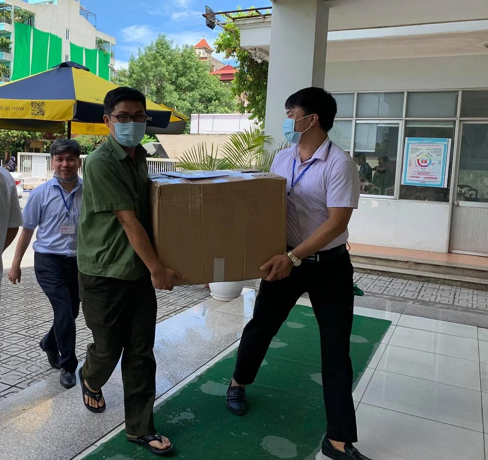 Thùng để thi được chuyển đến Điểm thi trường THPT chuyên Nguyễn Huệ, Hà Đông, Hà Nội. Ảnh: HÀ PHƯỢNG