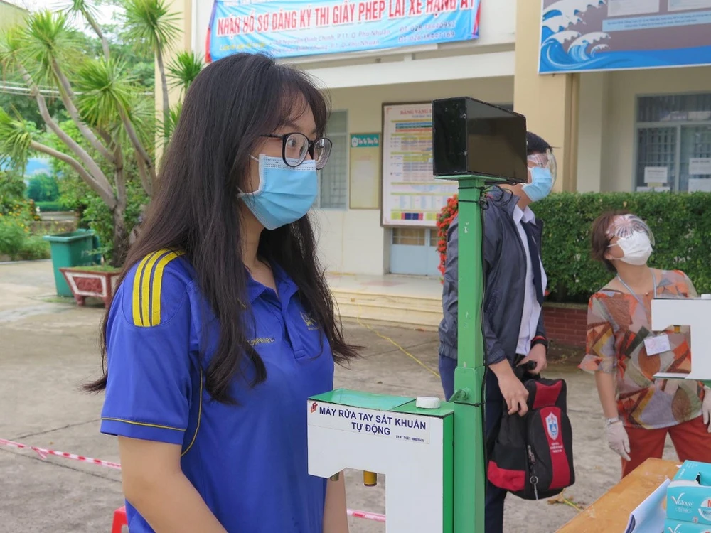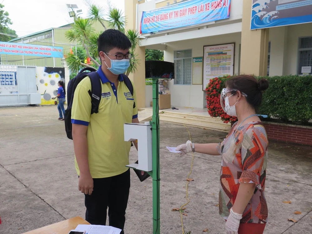 Tại điểm thi Trường THPT Phú Nhuận, TP.HCM năm nay có 480 em dự thi. Tại đây, công tác phòng dịch được triển khai nghiêm ngặt.