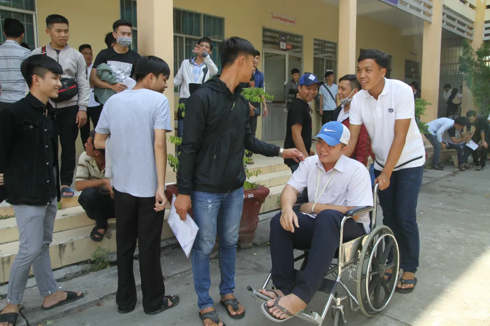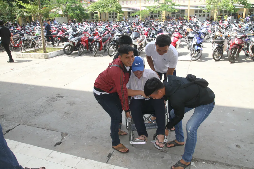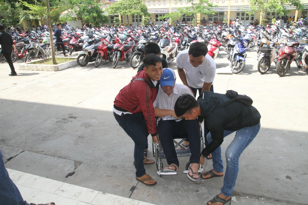 Đúng 14 giờ, cán bộ vào phòng thi ghi số thứ tự, các thí cũng nhanh chân đến trước phòng thi chờ làm vào phòng làm thủ tục. Lúc này có một thí sinh ngồi xe lăn, tay đeo băng được bạn đẩy đi tìm phòng thi. Tuy nhiên, phòng thi của thí sinh này ở trên lầu nên một số thí sinh khác đã đến giúp cùng nhau khiêng thí sinh cùng chiếc xe lăn lên lầu.