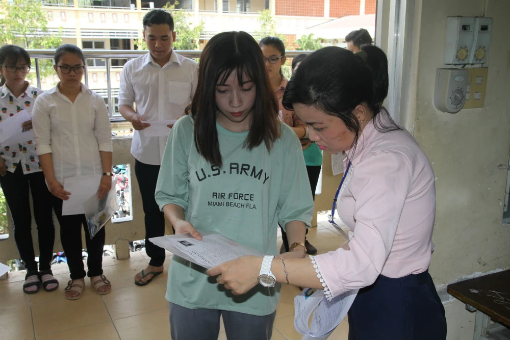 Cán bộ kiểm tra giấy tờ thí sinh trước khi vào phòng thi