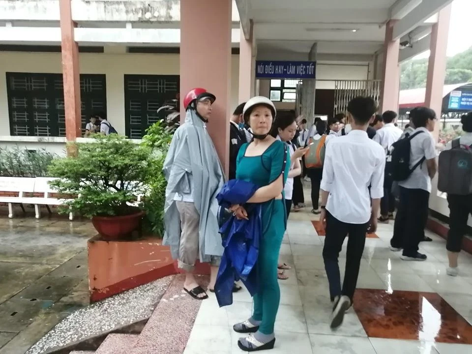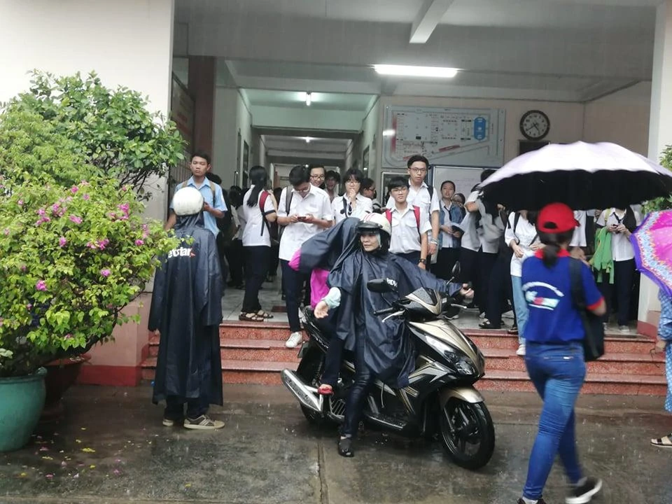 Chị Tạ Thị Bích Ngọc (quận 9) tại điểm thi THPT Nguyễn Hữu Huân, Thủ Đức chia sẻ:" Lúc đi đón cháu thấy trời mưa sợ cháu ốm. Kỳ thi quan trọng còn diễn ra 2 ngày cần đảm bảo sức khỏe để có thể thi tốt những môn còn lại".