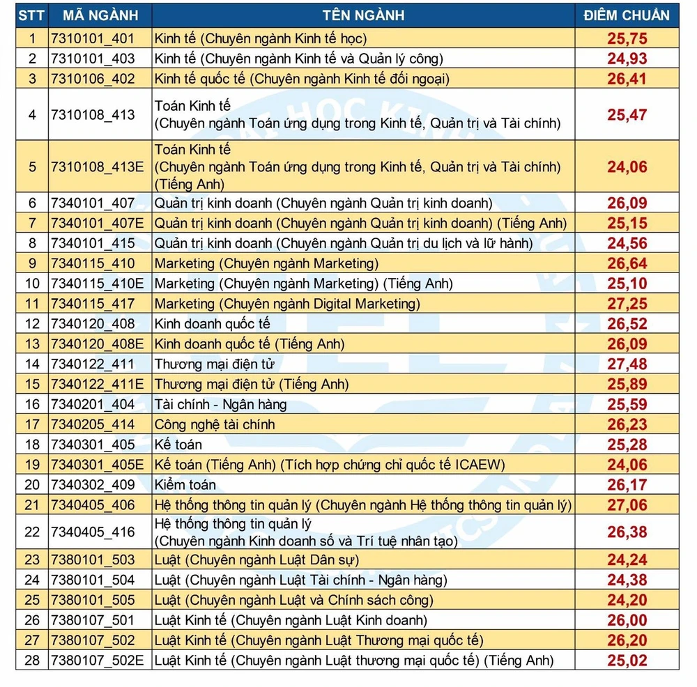 Điểm trúng tuyển trung bình tính theo các lĩnh vực đào tạo của trường ở khối kinh tế là 25,89 điểm, kinh doanh 26,04 điểm, luật là 25,32 điểm.