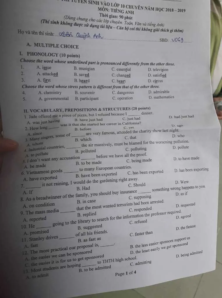 “Em thấy đề tiếng Anh khá ổn, khó hơn đề thi chung hôm trước. Nhưng vì hơi bỏ bê môn tiếng Anh để tập trung vào môn chuyên nên em làm không được tốt lắm. Em chỉ làm được trên điểm trung bình chứ không cao như các bạn khác”, em Thanh Thủy, Trường THCS Trường Chinh, bày tỏ.