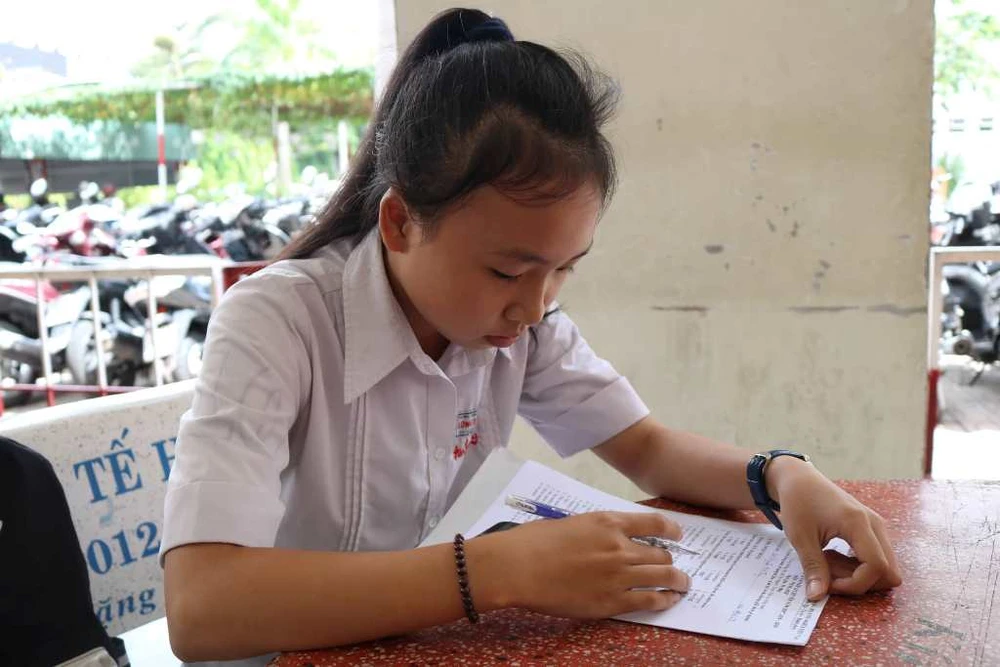 Em Anh Thy, Trường THCS Long Trạch, Long An, cho hay đề tiếng Anh không quá khó, vừa sức với chúng em. Đề sát với chương trình học, nhiều phần thi không phải suy luận nhiều. Ví dụ như phần reading thì chỉ cần đọc kỹ dữ liệu cung cấp trong bài là có thể làm được. Chỉ có phần gap-fillling là hơi thách đố một xíu. Em làm được khoảng 8 điểm. “Nhà ở xã, nên từ 5 giờ sáng em đã tới trường. Em sẽ ở lại điểm thi cho đến giờ thi môn chuyên chiều nay”, Anh Thy nói.