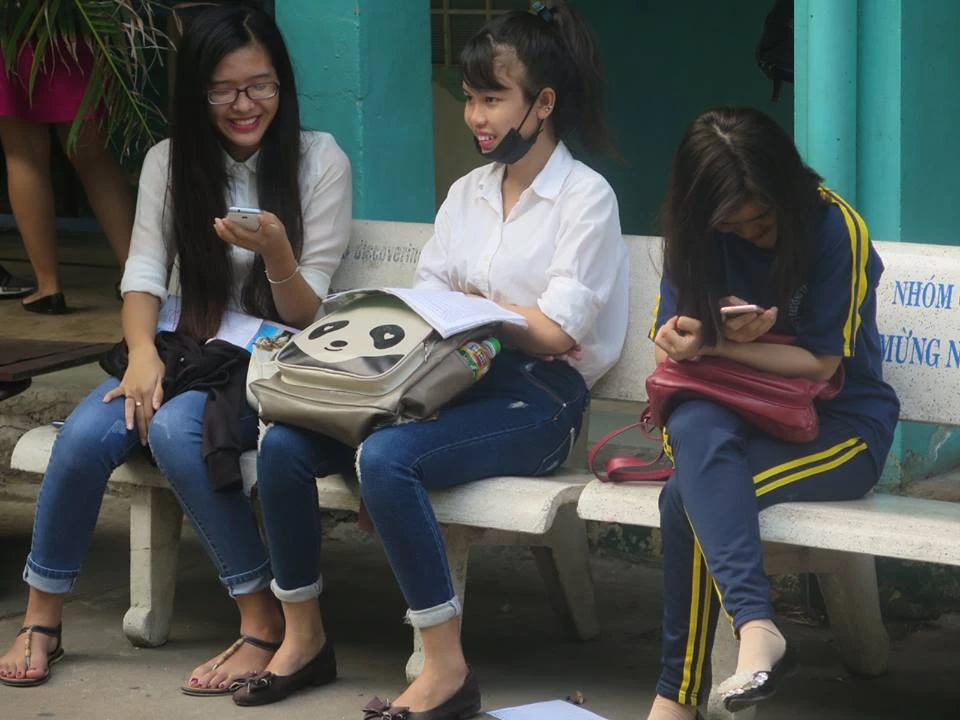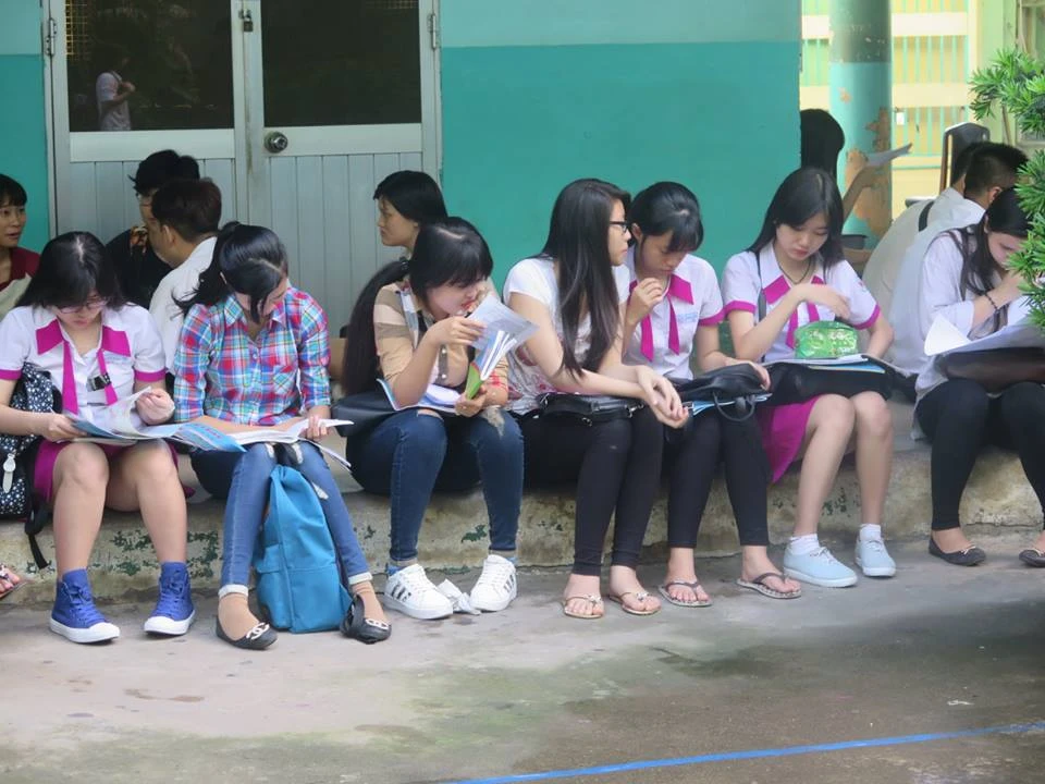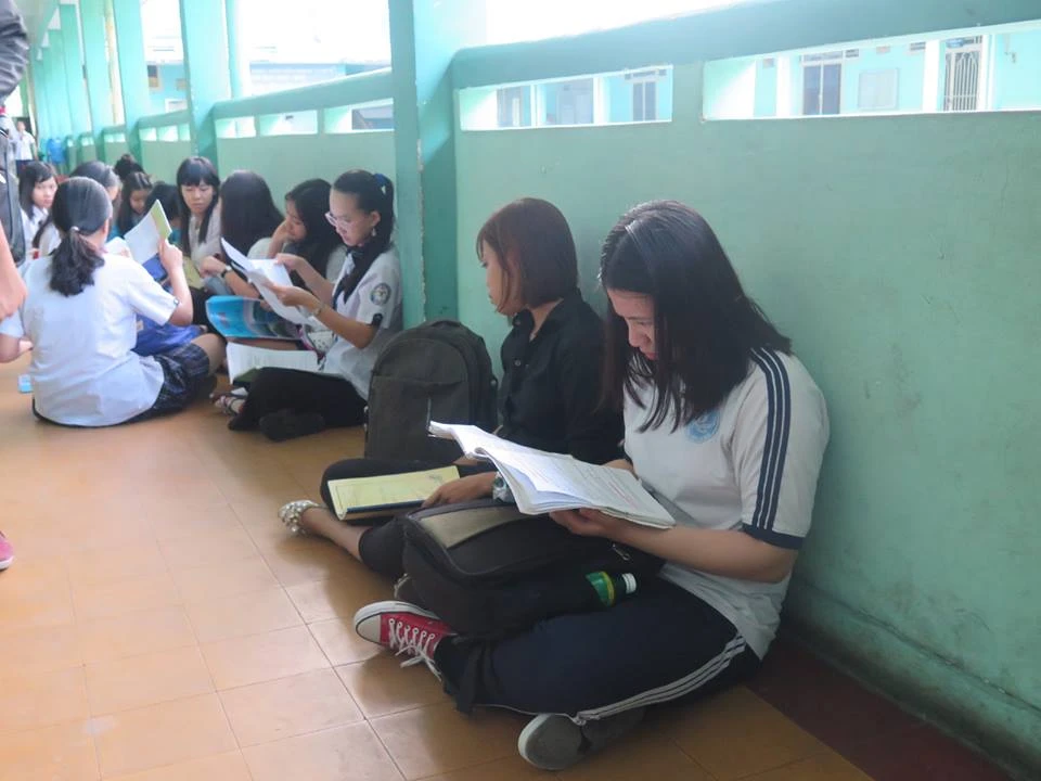 Ngay từ sáng sớm, các thí sinh đến trường từ rất sớm để tranh thủ ôn bài cùng các bạn. Hầu như em nào cũng đi thi với tâm lý thoải mái.