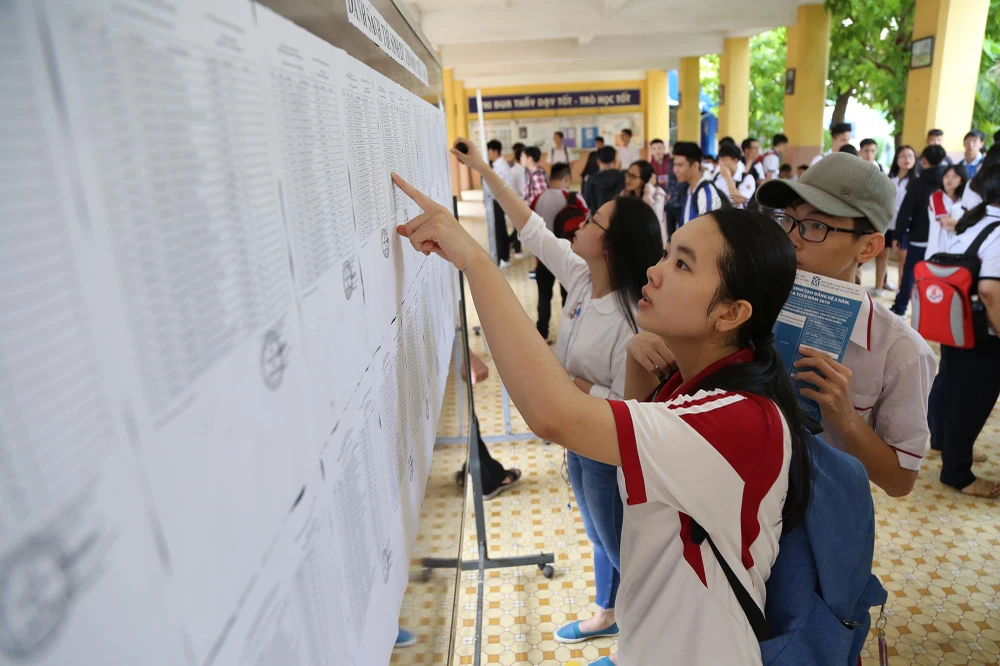Thí sinh xem danh sách phòng thi tại điểm thi THPT Nguyễn Thượng Hiền (quận Tân Bình, TP.HCM). Ảnh: HOÀNG GIANG