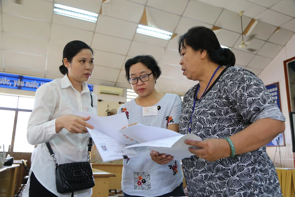 Các cán bộ coi thi tất bật trao đổi các nội dung cần thiết trước khi làm thủ tục thi cho thí sinh. Ảnh: HOÀNG GIANG