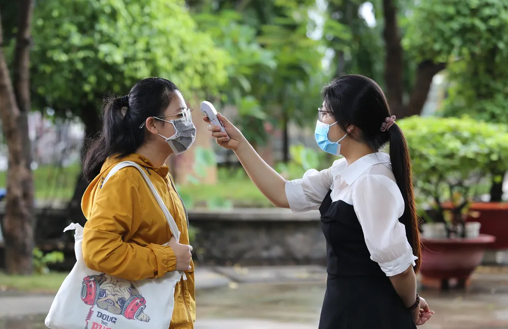 Tại đây, công tác phòng dịch được triển khai thực hiện qua nhiều khâu. Thí sinh vào cổng sẽ được đo nhiệt độ, khai báo y tế, rửa tay sát khuẩn, và xuất trình phiếu xác nhận xét nghiệm COVID-19.
