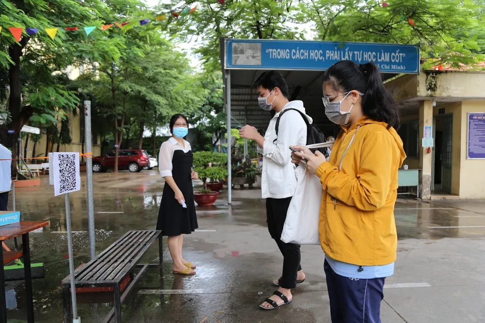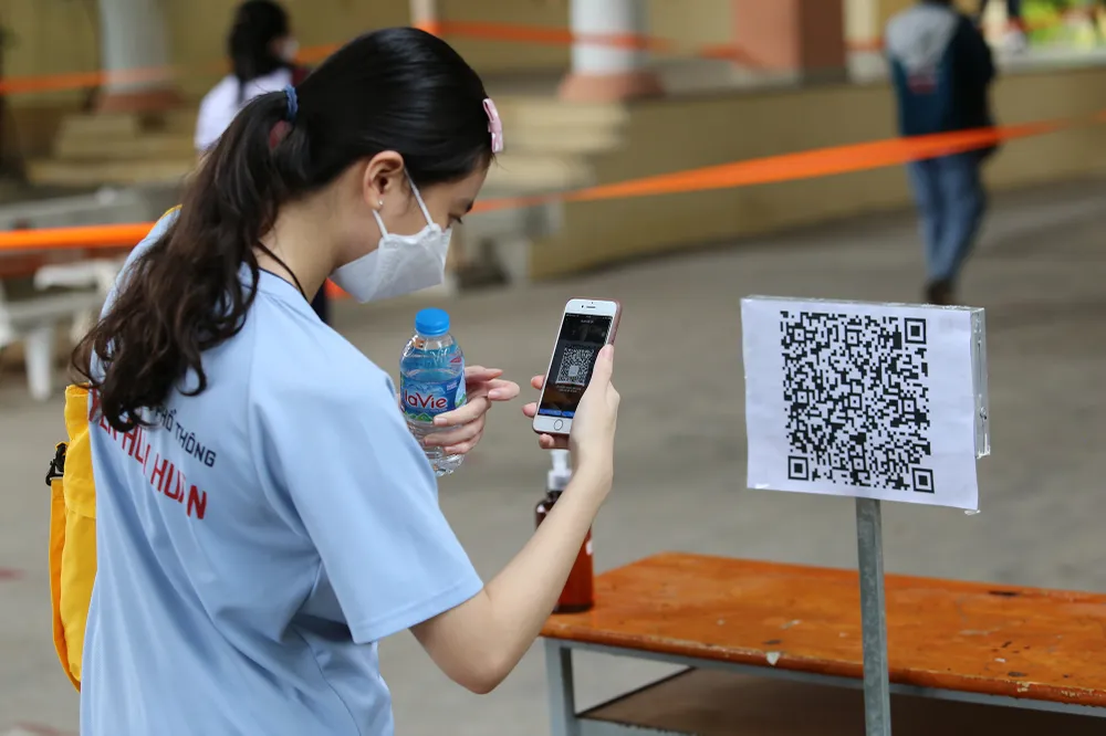 Thí sinh quét mã để khai báo y tế tại điểm thi. Điểm thi cũng chuẩn bị các tờ khai giấy để thí sinh khai báo khi không mang điện thoại quét mã QR.