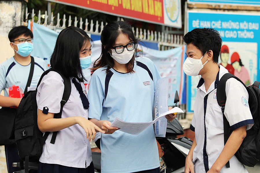 Các thí sinh vui vẻ trao đổi sau giờ thi toán tại điểm thi Trường THPT Hiệp Bình (TP Thủ Đức, TP.HCM) vào chiều 7-7. Ảnh: HOÀNG GIANG