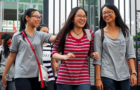 Các thí sinh hớn hở sau khi kết thúc kỳ thi tại cụm thi Trường ĐH Sư phạm TP.HCM. Ảnh: HTD