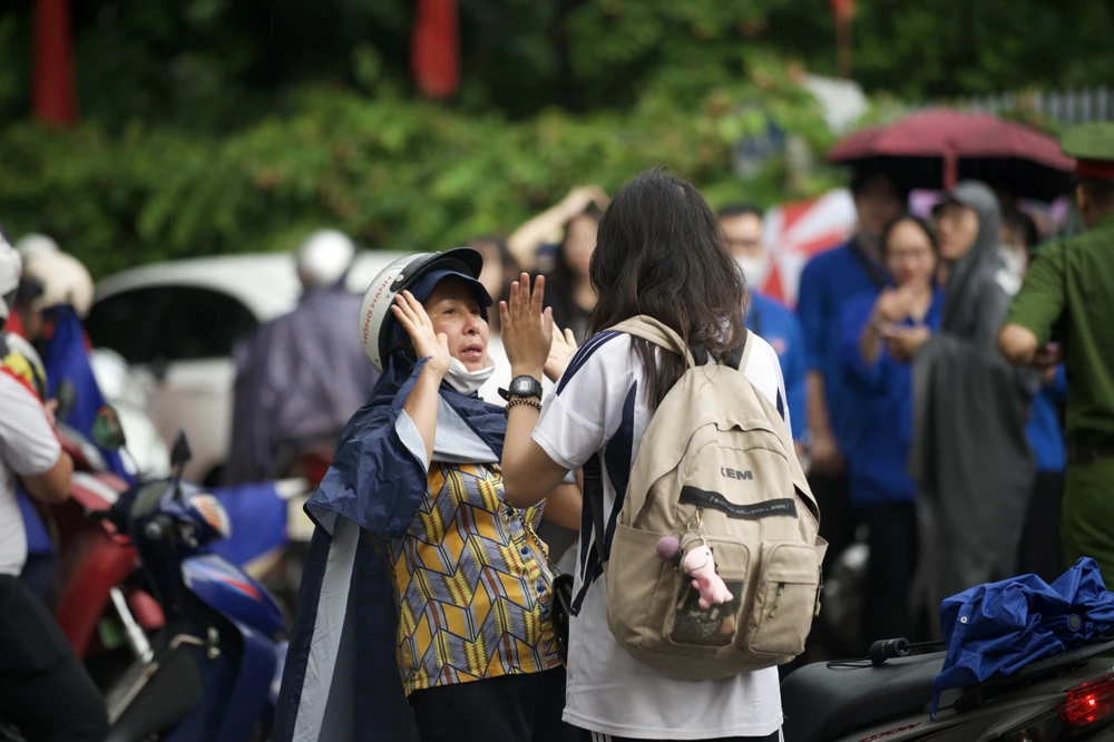 Ghi nhận tại điểm thi trường THPT Mỹ Đình, ngay từ sáng sớm, rất đông các lực lượng chức năng, tình nlguyện tiếp sức mùa thi đã có mặt để hỗ trợ thí sinh. Thí sinh được che ô, đưa vào bên trong điểm thi để tránh ướt những giấy tờ cần thiết, phục vụ cho quá trình thi.