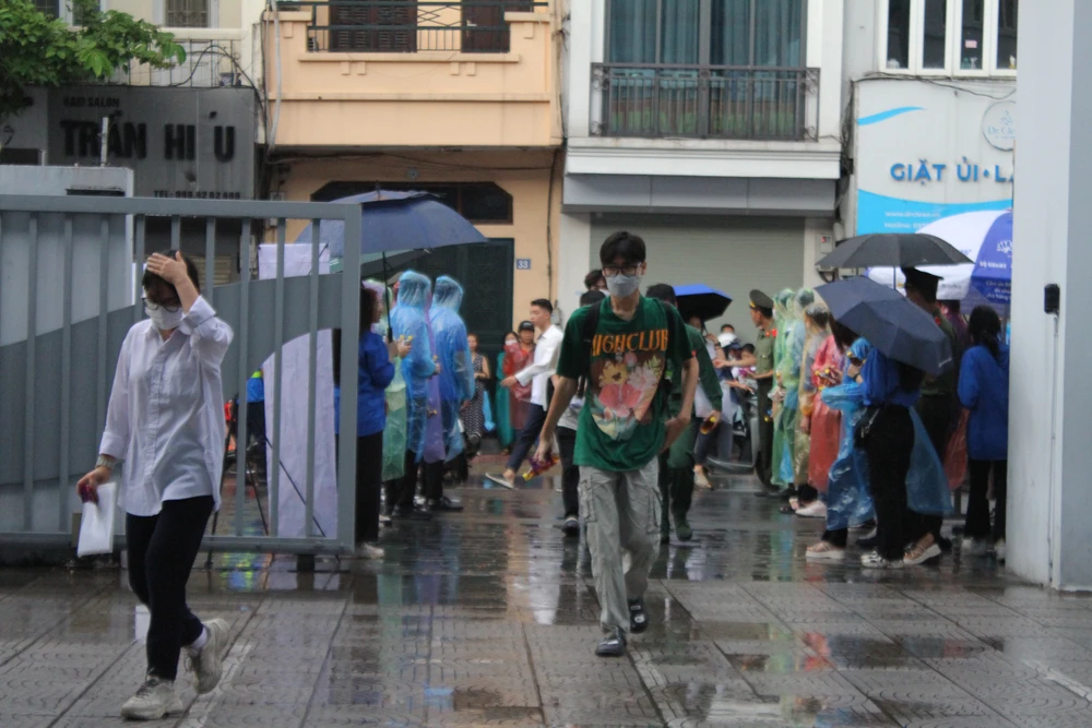 Tại điểm thi trường THCS Phan Chu Trinh (Hà Nội) từ sáng sớm, các lực lượng đã có mặt để điều phối, hướng dẫn các em thí sinh. Tuy nhiên, thời tiết Hà Nội hôm nay có phần không thuận lợi, mưa rào to vào sáng sớm khiến các thí sinh phải đội mưa đi thi.