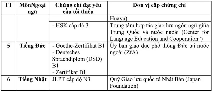 Thứ hai, thí sinh có một trong các chứng chỉ Ngoại ngữ (giống hoặc khác với môn Ngoại ngữ đang học tại trường phổ thông) hợp lệ, có giá trị sử dụng ít nhất đến ngày 27-6-2023 và đạt mức điểm tối thiểu theo bảng dưới đây:
