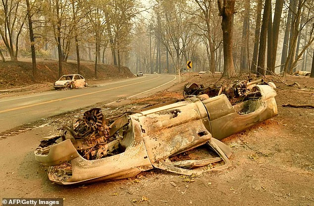 Những chiếc ô tô rằm rải rác trên đường trong đám cháy Camp Fire hôm 12-11. Ảnh: Daily Mail