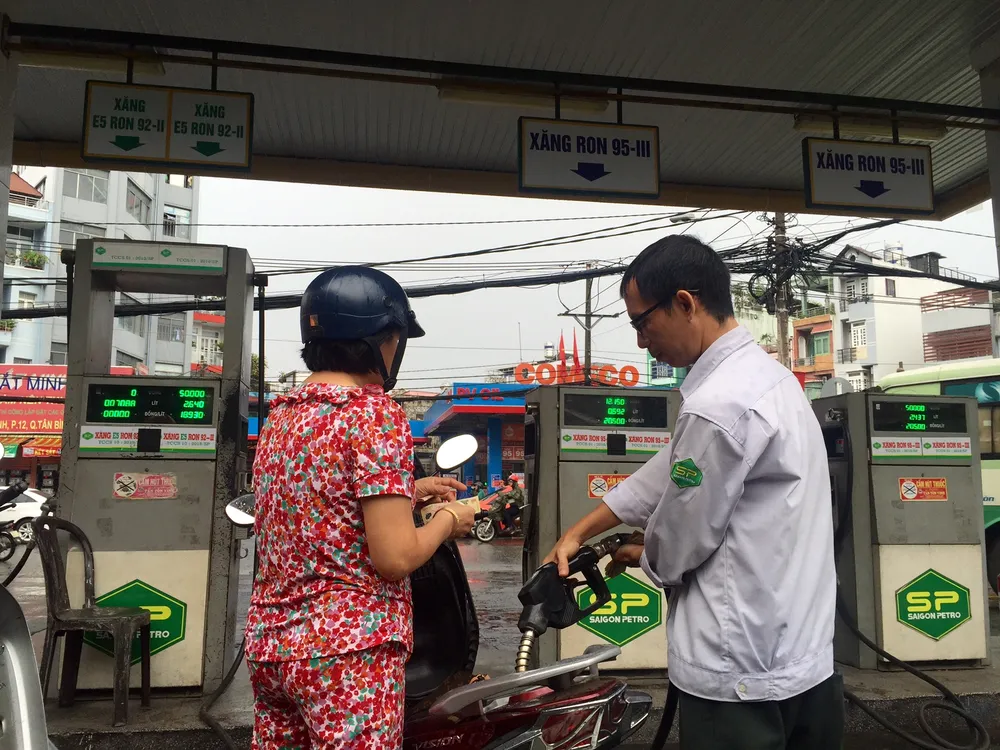 Khách hàng đang đổ xăng tại một cửa hàng xăng Saigon Petro (Ảnh TÚ UYÊN)