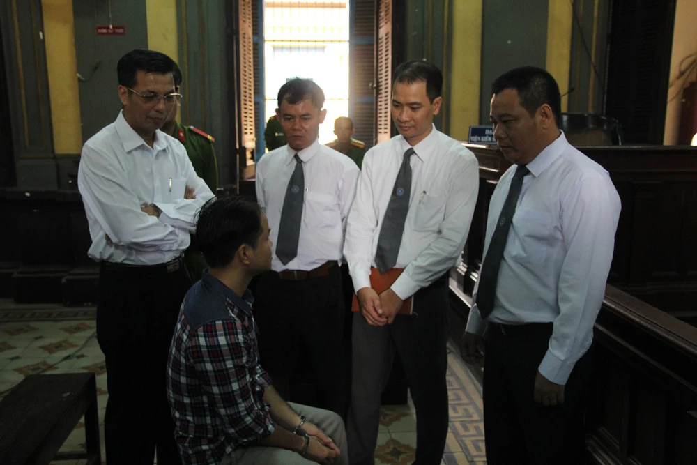 Luật sư Phạm Công Hùng cùng luật sư đồng nghiệp trao đổi với thân chủ trong giờ tòa nghị án.