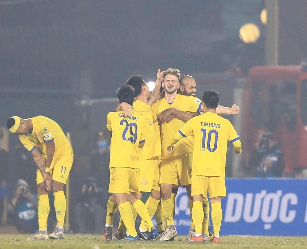 Các cầu thủ Nam Định đã "nhìn lên khán đài mà đá" rất nhiệt trước Hà Nội FC. ẢNH: NGỌC DUNG