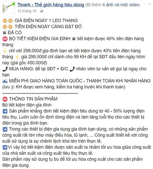Người viết thử lướt newsfeed, phát hiện một mẩu quảng cáo xuất hiện với lời rao: “Giá điện ngày một leo thang - tiền điện ngày càng đắt đỏ - đã có bộ tiết kiệm điện gia đình - tiết kiệm được 40% tiền điện hàng tháng”. Thử click vào nội dung quảng cáo để xem thì thấy lời rao khá hấp dẫn. Tuy nhiên, từng là dân kỹ thuật điện, người viết khá bất ngờ vì thiết bị có giá quá rẻ. Lần mò từ thiết bị điện siêu tiết kiệm này, chúng tôi lên một trang thương mại điện tử để tìm kiếm sản phẩm này. Chỉ cần gõ cụm từ “Thiết bị tiết kiệm điện” đã cho ra hàng loạt sản phẩm có giá thành từ 89.000 đến 300.000 đồng. Tuy nhiên, sản phẩm lại chỉ có một mẫu mã và thông số cũng chẳng khác gì nhau.