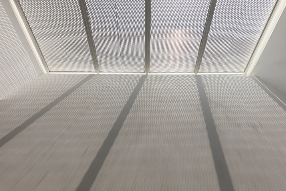 Khi nắng lên, những lam chắn nắng in hoa văn lên bức tường.