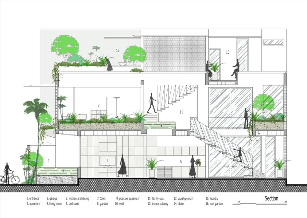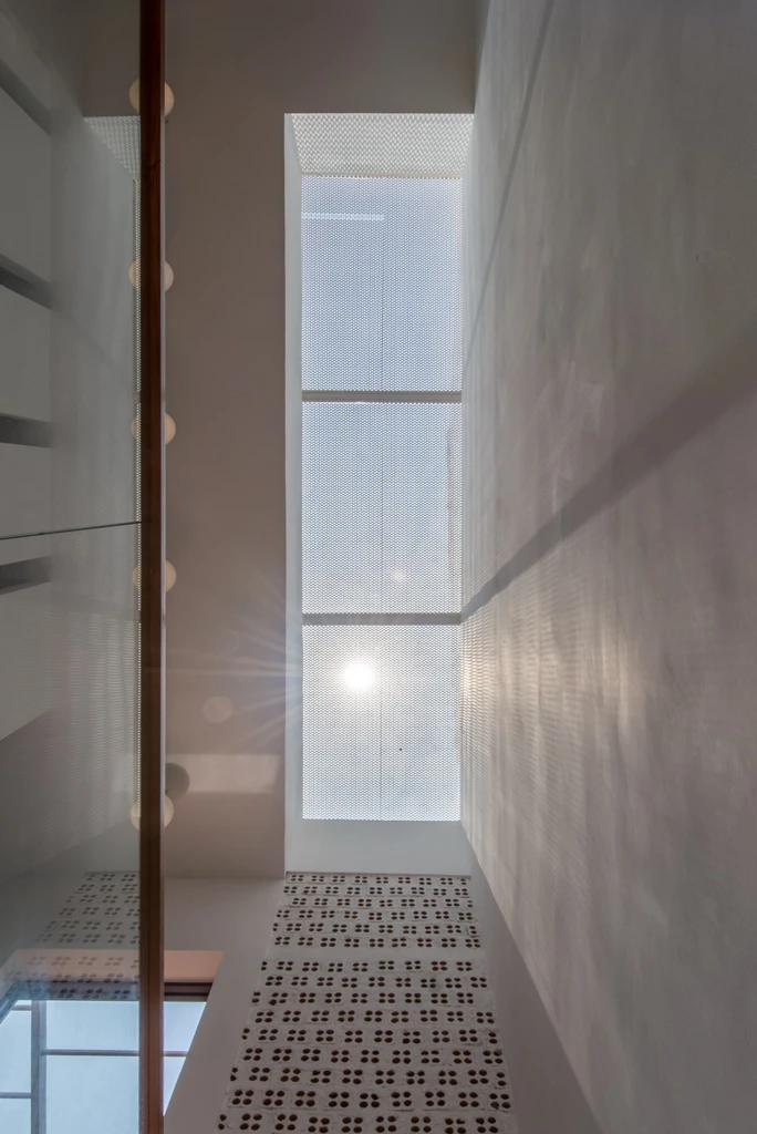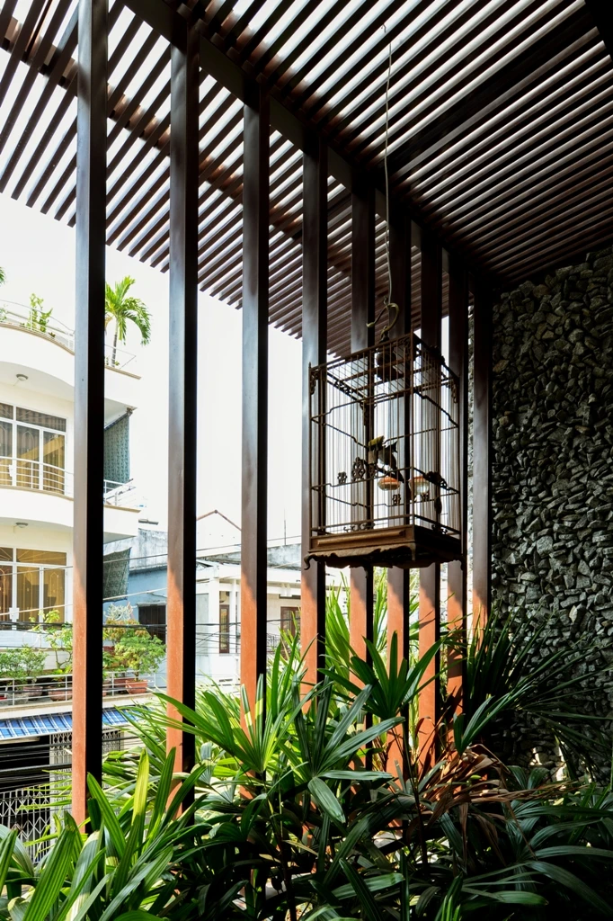 Giải quyết thông gió tự nhiên cho ngôi nhà theo phương pháp thông gió ngang và đối lưu không khí theo chiều đứng. Hàng rào bông gió, cây xanh và hồ cá như khoảng đệm ngăn bụi, giảm ồn, tách dòng giao thông tấp nập của khu chợ, lọc gió mang hơi nước từ hồ cá động xuyên nhà.