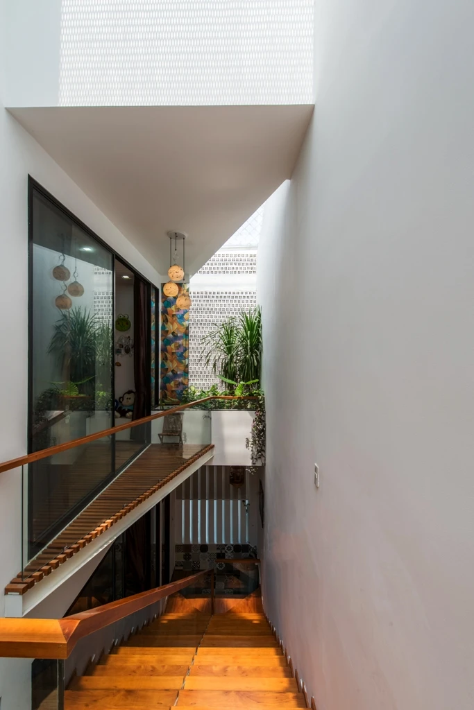 Tầng 2 tiếp cận hai giếng trời là phòng ngủ nhỏ, mở ra hai mảng xanh, có một sàn lam gỗ có tác dụng như ban công trong nhà.