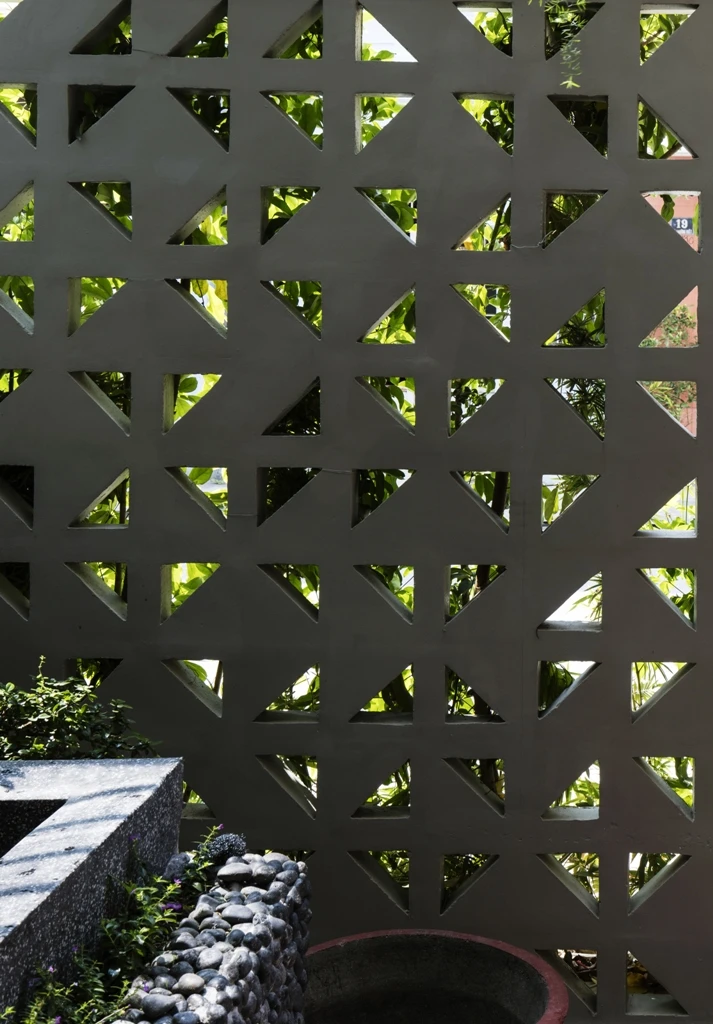 Hàng rào bông gió bê tông, cây xanh và hồ cá trước phòng khách như khoảng đệm ngăn bụi, giảm ồn.