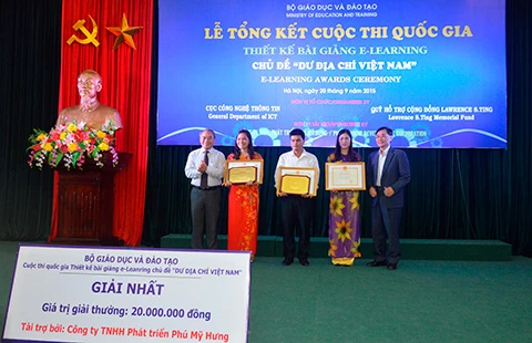 Ông Nguyễn Vinh Hiển, Thứ trưởng Bộ GD&ĐT, trao giải cho các tác giả đoạt giải cao tại lễ tổng kết cuộc thi.