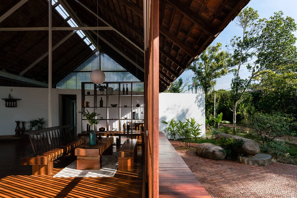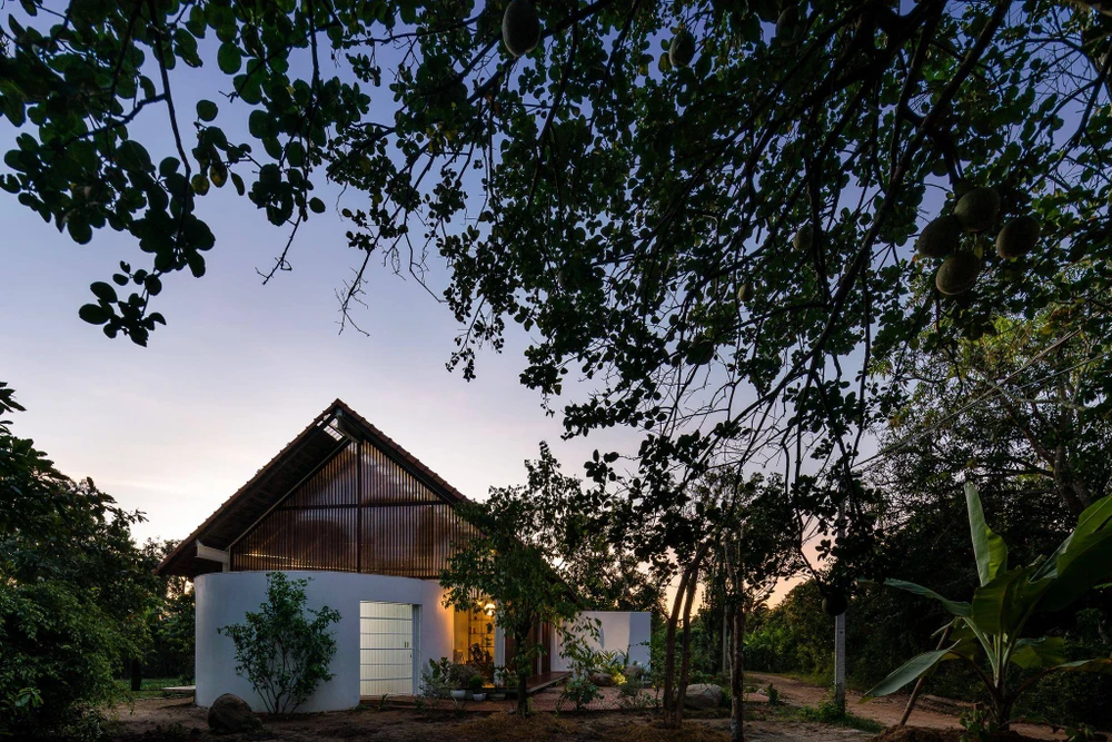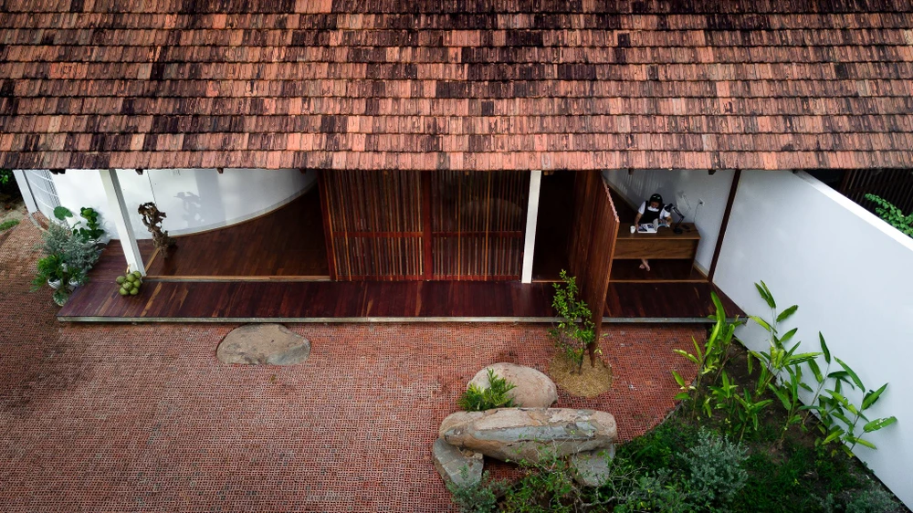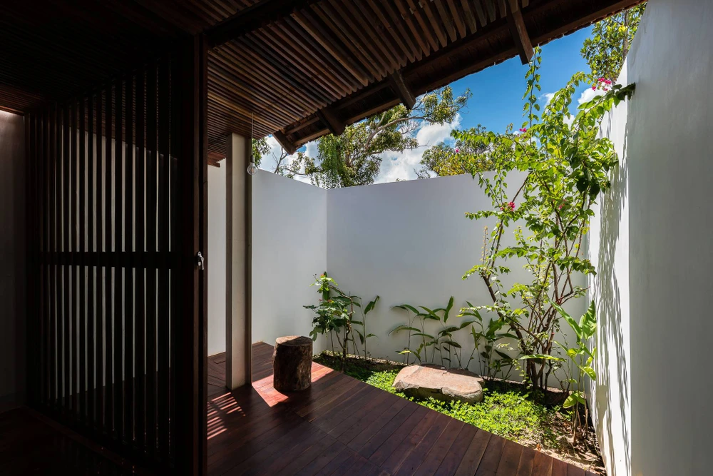 Các không gian riêng tư được kéo dãn ra ngoài biên của hệ mái, đóng khung một phần cảnh quan của khu đất hiện có nhằm điều tiết khí hậu và tăng tính trải nghiệm cho gia chủ.
